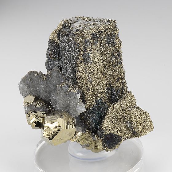 Neat combination sulfide specimen showing large crystals of terminated enargite in a cluster with crystallized quartz. A dusting of micro pyrite crystals upon the enargite crystals, as well as a second-generation of sharp larger pyrite crystals. From material collected in the middle to late 1990s. In great condition.Data last checked on 11th Aug 2021 - specimen may no longer be available