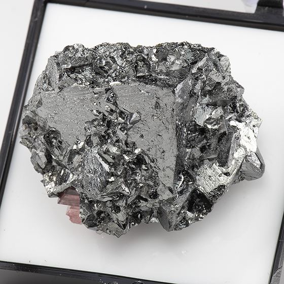 Large bright lustrous crystals of tetrahedrite in a cluster with minor rhodochrosite. In great condition, this is excellent for the species from this locality. Collected in 2004. Mounted for display in a perky box and will ship as shown.Data last checked on 11th Aug 2021 - specimen may no longer be available