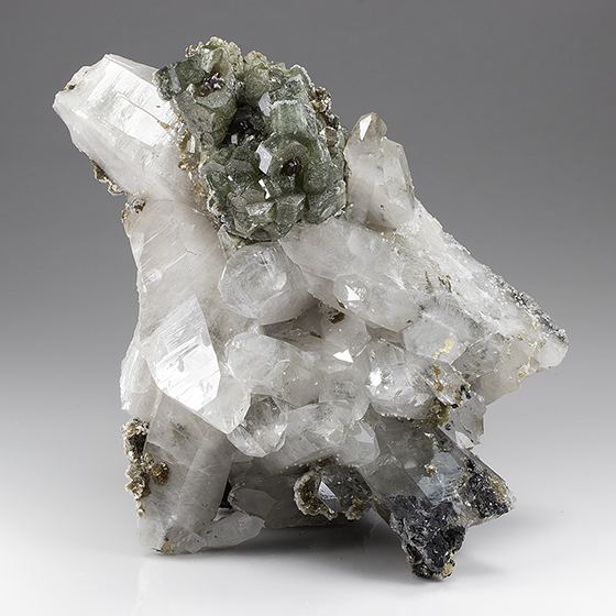 A cluster of green tabular fluorapatite crystals 8.0 cm across, the crystals measuring to 2.3 cm, set beautifully up on glassy gemmy crystals of quartz measuring to 10.0 cm in length. Minor sphalerite, muscovite, and calcite present as well. In great condition, wonderful large cabinet combination piece from this classic locality.Data last checked on 11th Aug 2021 - specimen may no longer be available