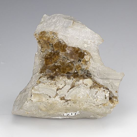 Glassy gemmy cubic crystals of fluorite to 0.6 cm on edge across the front of this matrix. In good condition.Data last checked on 11th Aug 2021 - specimen may no longer be available