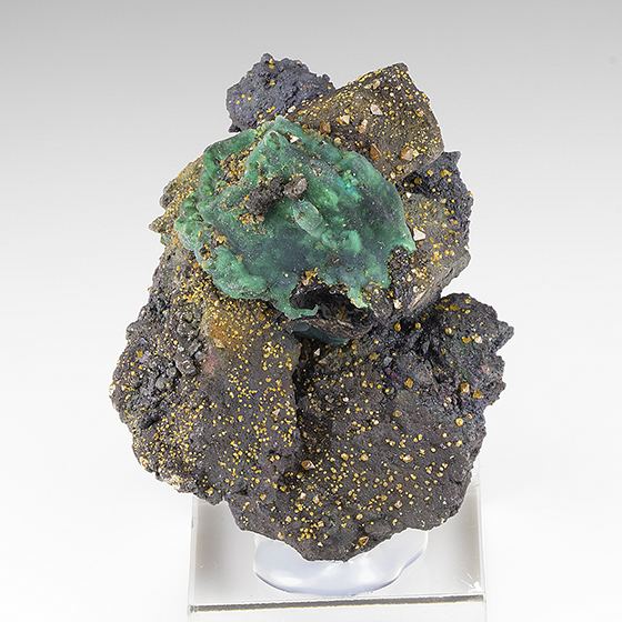 A grouping of what were once bladed azurite crystals 2.6 cm across now replaced by green crystalline malachite set on a breccia matrix with small wulfenite crystals scattered throughout. In good condition.Data last checked on 11th Aug 2021 - specimen may no longer be available