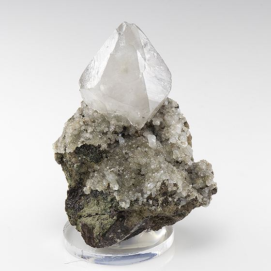 Glassy partly gemmy grouping of colorless scalenohedral calcite crystals to .3 cm in height on matrix. Very slight micro-chipping present on the termination. The crystal is complete all around. Minor native copper present as well.Data last checked on 11th Aug 2021 - specimen may no longer be available