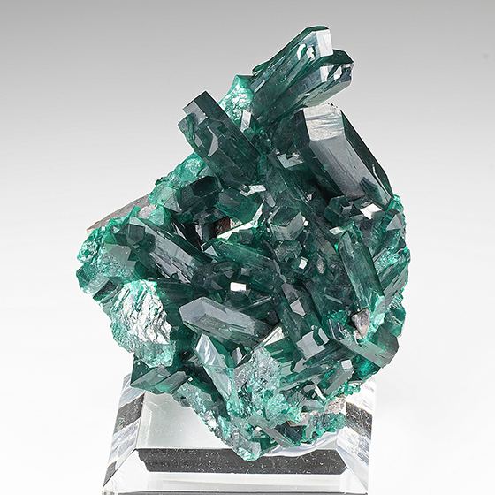 Lustrous deep green slightly translucent crystals of dioptase to 2.2 cm in length aesthetic on matrix. Some chipping present, this mainly confined to the edges, all the prominent crystals in very good condition as seen.Data last checked on 11th Aug 2021 - specimen may no longer be available