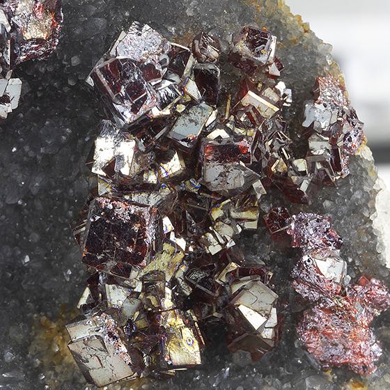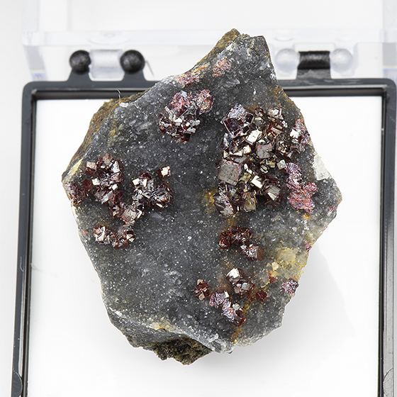 Superb example for the species from the type locality. Deep red slightly translucent crystals to 0.3 cm in size across the front of this matrix. In very good condition with slight micro chipping present. Collected August 10, 1996 from the 182 drift, 4850 level, self pit underground at this locality. Mounted for display in a perky box and will ship as shown.Data last checked on 11th Aug 2021 - specimen may no longer be available