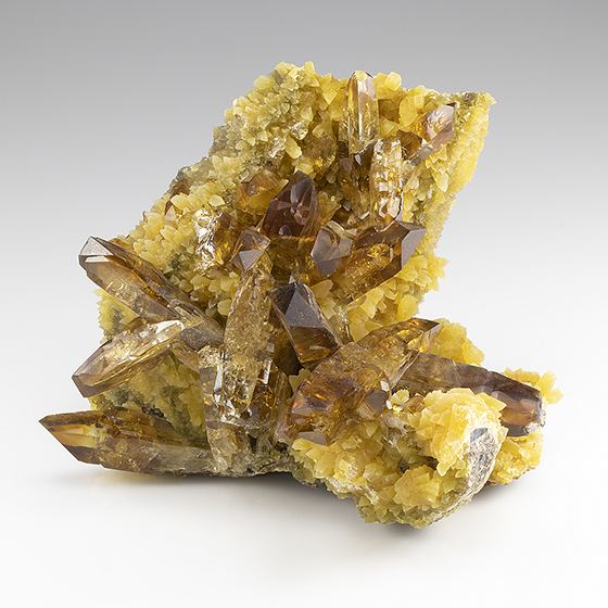 Many choice glassy and gemmy amber colored crystals of barite to 5.5 cm in length throughout this matrix with yellow crystallized calcite. I think in great condition.Data last checked on 11th Aug 2021 - specimen may no longer be available