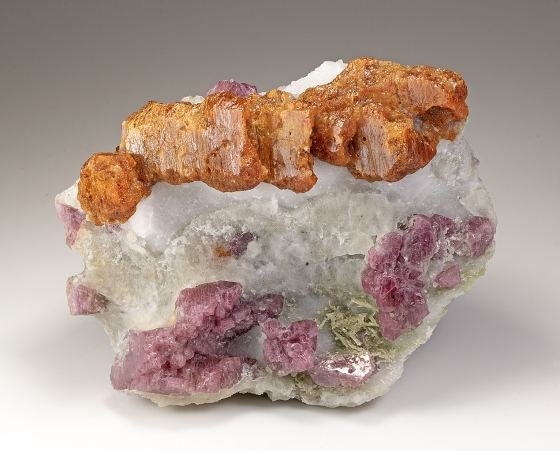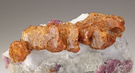 A world-class large cabinet display specimen for the species. Lustrous orange crystals to 6.0 cm in length are ringing the top of this massive calcite matrix. Purplish pink lustrous crystals of spinel to almost 3.0 cm are accented throughout. The piece sits beautifully by itself or display and is in outstanding condition.Data last checked on 11th Aug 2021 - specimen may no longer be available