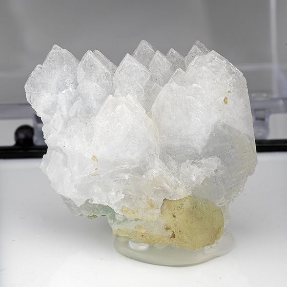 Unusual locality example for the species, colorless to light blue translucent crystal cluster of Celestine without matrix. In good condition.Mounted for display in a perky box and will ship as shown.Data last checked on 11th Aug 2021 - specimen may no longer be available