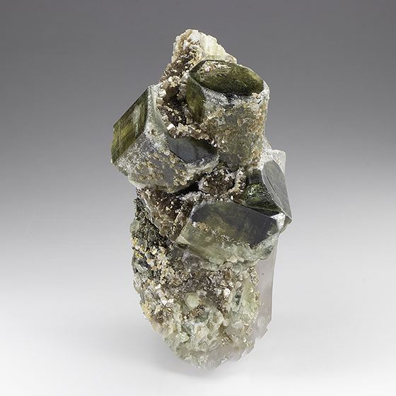 Large glassy partly gemmy green crystals of fluorapatite to 4.0 cm in size on a crystallized quartz matrix. Buyer muscovite, siderite, and pyrite present. This is in very good condition with just some slight contacting on the backside of the quartz crystal. This is not in view when the piece is properly displayed.Data last checked on 11th Aug 2021 - specimen may no longer be available