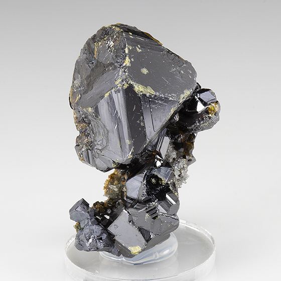 An enormous lustrous sharp black crystal of sphalerite 2.4 cm in size on a crystallized quartz matrix with numerous smaller crystals. What at first appears to be damaged or chipping on this one is actually just a different color along the edges of the big crystal, and the piece is in remarkably good condition. Quite nice for this old locality.Data last checked on 11th Aug 2021 - specimen may no longer be available