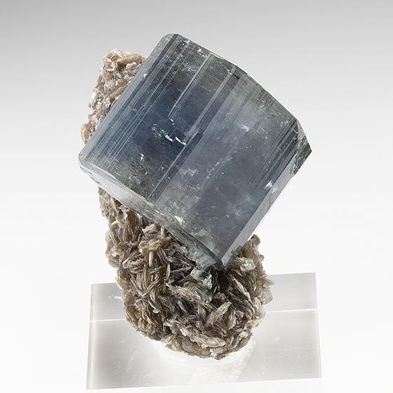 Mostly gemmy glassy bluish green tabular crystal of fluorapatite 3.0 cm across perched beautifully on muscovite. In super condition. The quality extremely high.Data last checked on 11th Aug 2021 - specimen may no longer be available