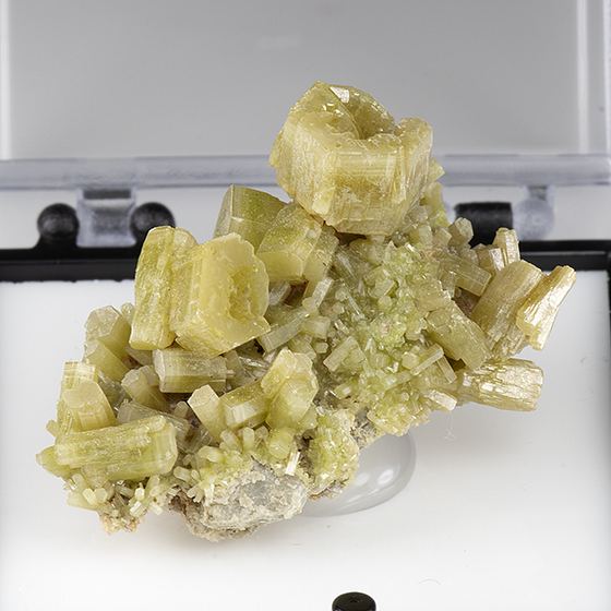 Superb thumbnail sized grouping of yellowish green barrel shaped pyromorphite crystals. In great condition. Very choice for this locality. Mounted for display in a perky box and will ship as shown.Data last checked on 11th Aug 2021 - specimen may no longer be available