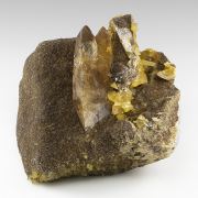 Lustrous gemmy amber colored crystals of barite on matrix with yellow crystallized calcite. In good condition with minimal micro-chipping and cleaving present.Data last checked on 11th Aug 2021 - specimen may no longer be available