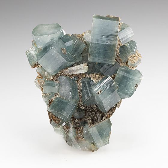 Glassy mostly gemmy bluish green tabular crystals of fluorapatite to 3.0 cm in size across the top of this thin matrix of crystallized muscovite. Classic material for this locality, this piece is in super condition as seen.Data last checked on 11th Aug 2021 - specimen may no longer be available