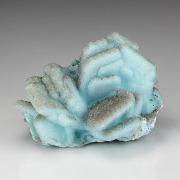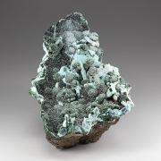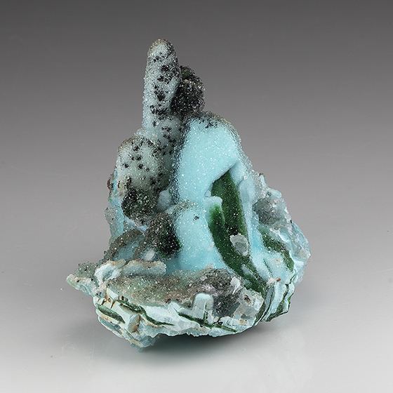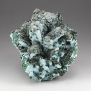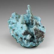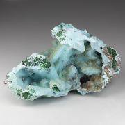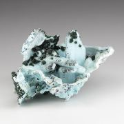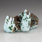 From recent find in the Congo, a beautiful specimen showing bladed crystals of what were likely once azurite or barite measuring to 3.5 cm in length now replaced by sky-blue attractive chrysocolla. Green malachite scattered throughout, the entire specimen coated with a druse of sparkling micro quartz crystals. In very good condition as seen.Data last checked on 11th Aug 2021 - specimen may no longer be available