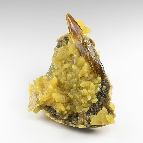 Gemmy amber colored crystals of barite to 5.3 cm in length on matrix with yellow crystallized calcite. In good condition.Data last checked on 11th Aug 2021 - specimen may no longer be available