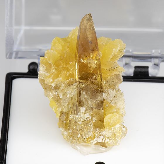 Glassy gemmy amber colored crystal of barite 1.8 cm in height on yellow crystallized calcite. In great condition. Mounted for display in a perky box and will ship as shown.Data last checked on 11th Aug 2021 - specimen may no longer be available