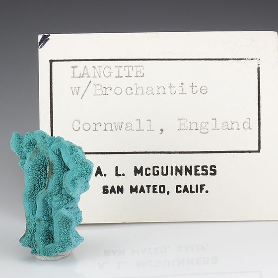 Beautiful blue to bluish green crystallized langite without matrix. In great condition. Previous label from dealer A.L. McGuinness. Minor brochantite present.Data last checked on 11th Aug 2021 - specimen may no longer be available