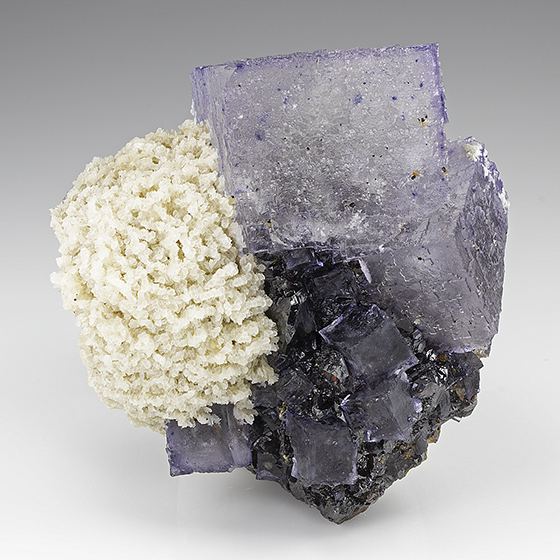 Gem light purple fluorite crystals to 4.0 cm on edge set on a crystallized black sphalerite matrix with white crystallized barite. In great condition. Nice combination piece.Data last checked on 11th Aug 2021 - specimen may no longer be available