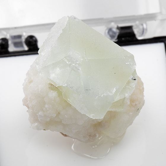 Light green transparent octahedral fluorite crystal perched nicely on a calcite matrix. In terrific condition, excellent thumbnail specimen for this classic locality. Previous label notes at one time part of the collection of Dr. L.D. Dickey. Mounted for display in a perky box and will ship as shown.Data last checked on 11th Aug 2021 - specimen may no longer be available