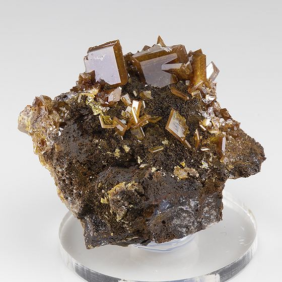 Very fine for the species from the state of Nevada, glassy lustrous tabular crystals to 0.6 cm on edge across the top of this matrix. Very slight micro-chipping present but the prominent crystals in good condition. This came from the 7060 bench in the Northwest pit.Data last checked on 11th Aug 2021 - specimen may no longer be available