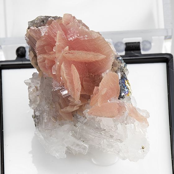 Beautiful pink bladed crystals of rhodochrosite to 1.2 cm in size set on a crystallized quartz matrix with fluorite and sphalerite. This is in very good condition. From production in 2003. Mounted for display in a perky box and will ship as shown.Data last checked on 11th Aug 2021 - specimen may no longer be available