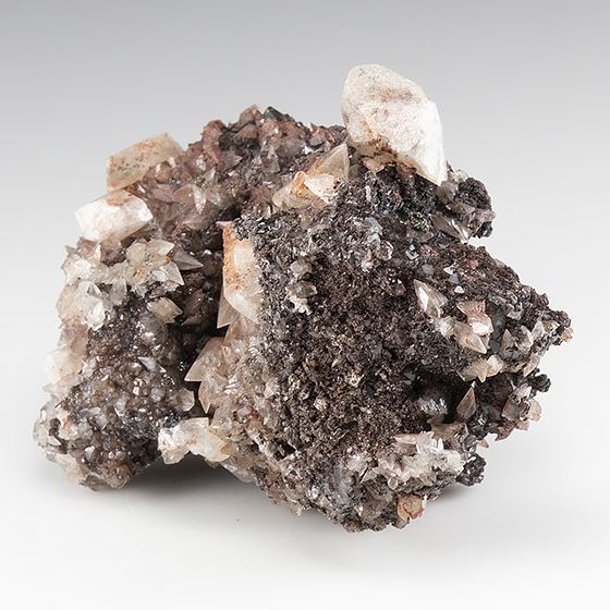 Colorless to slightly reddish crystals of scalenohedral calcite to 1.2 cm in size across the top of this hematite rich matrix with sparkling crystallized quartz. Cleaving present but sparse, still in nice condition.Data last checked on 11th Aug 2021 - specimen may no longer be available