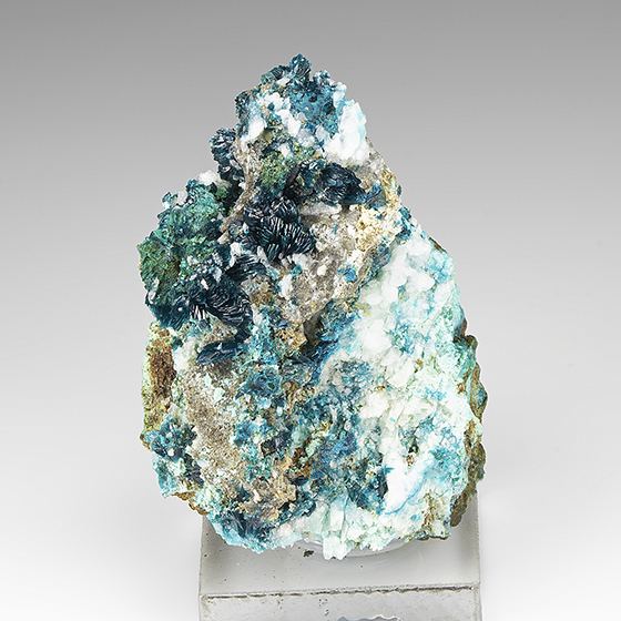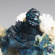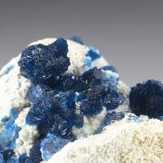 Sparkling deep blue crystals of terminated veszelyite to 0.5 cm in size very rich across the front of this matrix with hemimorphite. Sky-blue platy theisite present as well. Tiny and sparse micro-chipping present, overall I think in great condition. Excellent for this rare mineral. From recent finds in early 2021.Data last checked on 11th Aug 2021 - specimen may no longer be available