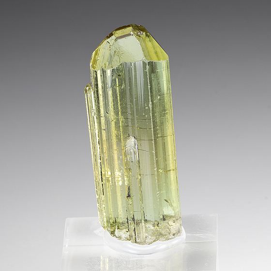 Glassy absolute gem quality sharply terminated in perfect greenish elbaite crystal. This weighs 92.01 carats. Perfect all around. The quality is outstanding. Naturally healed on the base.Data last checked on 11th Aug 2021 - specimen may no longer be available