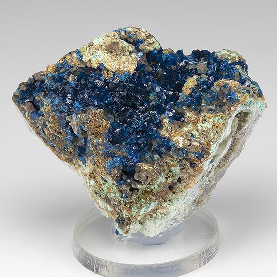 Vivid sparkling deep blue crystals of veszelyite across the front of this matrix with hemimorphite. Tiny and sparse micro-chipping present, overall I think in great condition. Excellent for this rare mineral. From recent finds in early 2021.Data last checked on 11th Aug 2021 - specimen may no longer be available