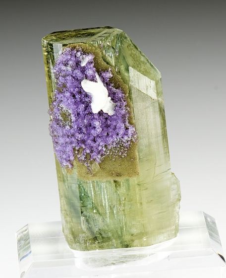 Very neat combination piece, this a double terminated floater glassy gem green fluorapatite crystal partially coated with lovely purple micro crystals of fluorite and some siderite. In super condition all around. Comes with a custom acrylic display base.Data last checked on 11th Aug 2021 - specimen may no longer be available