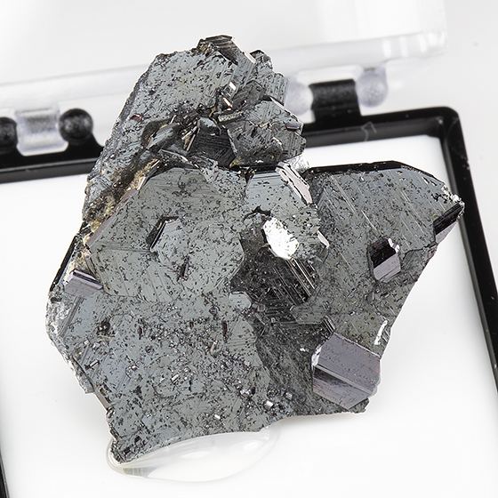 Classic loose grouping of platy lustrous thin hematite crystals. Deep red prismatic crystals of rutile to 0.5 cm are present upon the faces. This has chipping on the edges as seen. Mounted for display in a perky box and will ship as shown.Data last checked on 11th Aug 2021 - specimen may no longer be available