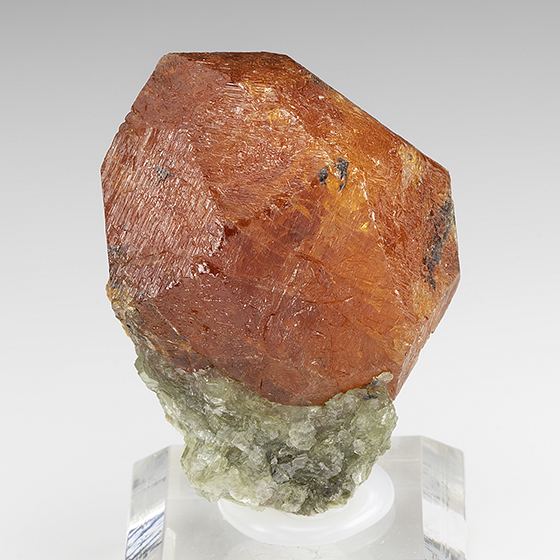 A superb miniature for this species with a large fine crystal on matrix! A brilliant slightly translucent striated bright orange spessartine crystal measuring 3.6 x 3.5 x 2.6 cm in size set on a small amount of schist matrix. Free-standing and free of damage; this is complete all around 360 degrees. The quality is excellent; this is a beautiful miniature specimen! Size: 5.0 x 3.5 x 3.0 cm.Data last checked on 11th Aug 2021 - specimen may no longer be available