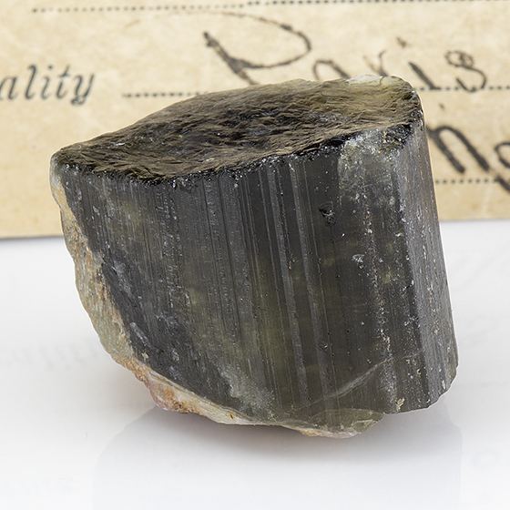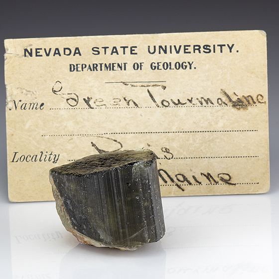 A green striated lustrous slightly translucent terminated elbaite crystal. Complete all around, this is naturally crystallized even on the backside. Previous antique label from the collection at Nevada State University, Department of Geology.Data last checked on 11th Aug 2021 - specimen may no longer be available