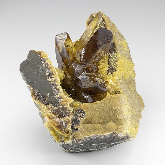 Glassy gem crystals of barite to 4.0 cm in height coming off matrix with crystallized calcite. In very good condition as seen. Classic material for this locality.Data last checked on 11th Aug 2021 - specimen may no longer be available