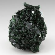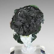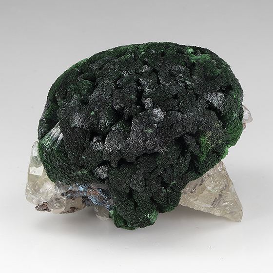 A really neat well crystallized primary malachite specimen forming a spherical shaped grouping, this with one side rich scalenohedral crystals of gemmy calcite. No real points of attachment and in very good condition. Also light blue minor plancheite present.Data last checked on 11th Aug 2021 - specimen may no longer be available