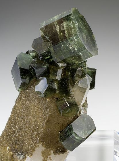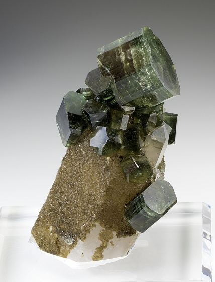 Incredibly glassy mostly gemmy color zone deep green tabular crystals of fluorapatite to almost 3.0 cm in size incredibly aesthetic up on a grouping of glassy gemmy quartz crystals with minor siderite. This has been repaired, it is difficult to find where in the job is well done. In super condition all around. Comes with a custom acrylic display base.Data last checked on 11th Aug 2021 - specimen may no longer be available