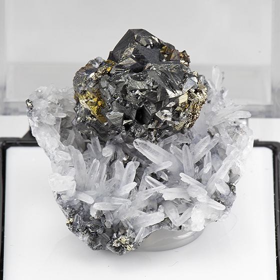 Excellent for the species from this locality with a grouping of metallic tetrahedrite crystals 1.5 cm across set perfectly up on a crystallized quartz matrix with chalcopyrite and pyrite. In terrific condition. Collected in 2004. Mounted for display in a perky box and will ship as shown.Data last checked on 11th Aug 2021 - specimen may no longer be available