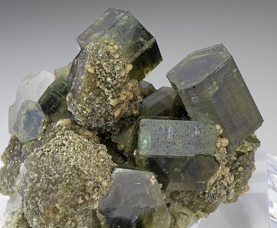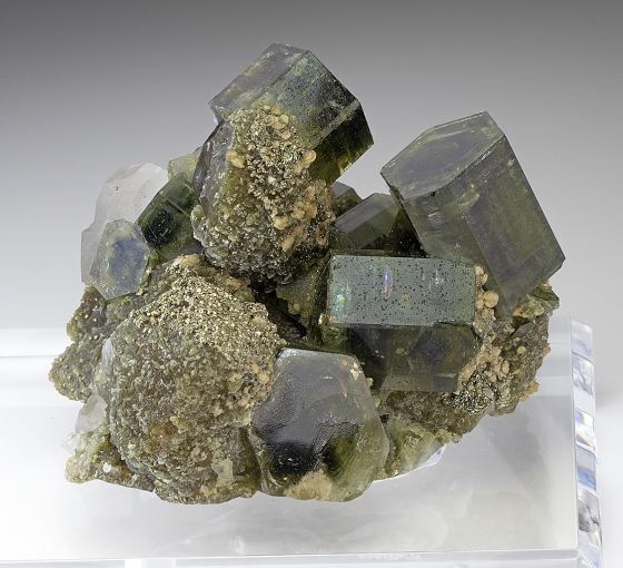Highly translucent almost gemmy deep green glassy tabular crystals of fluorapatite showing me color zoning in measuring to 2.5 cm in length on a crystallized pyrite matrix of quartz. This is in super condition. The piece has been repaired, it is better than expertly and it is very difficult to see exactly where. Comes with a custom acrylic display base.Data last checked on 11th Aug 2021 - specimen may no longer be available