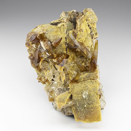 Many fine glassy gemmy amber colored crystals of barite to 3.0 cm in length across the top of this brecciated matrix with yellow crystallized calcite. Considering the number of crystals present on this one the condition is absolutely outstanding.Data last checked on 11th Aug 2021 - specimen may no longer be available