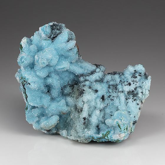 From recent find in the Congo, a beautiful specimen showing bladed crystals of what were likely once azurite or barite measuring to 2.5 cm in length now replaced by sky-blue attractive chrysocolla. Green malachite scattered throughout, the entire specimen coated with a druse of sparkling micro quartz crystals. In very good condition as seen.Data last checked on 11th Aug 2021 - specimen may no longer be available