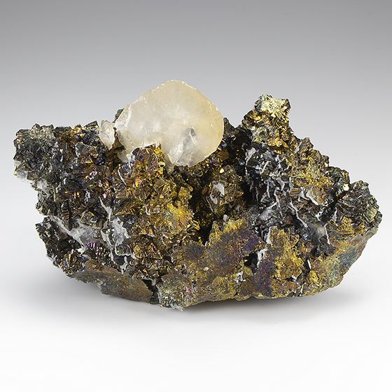 A flattened rhombohedral crystal of semi lustrous translucent calcite 4.0 cm across set beautifully on top of a matrix of crystallized somewhat iridescent and brassy chalcopyrite. Very minimal and sparse micro-chipping present, this still in very good condition.Data last checked on 11th Aug 2021 - specimen may no longer be available