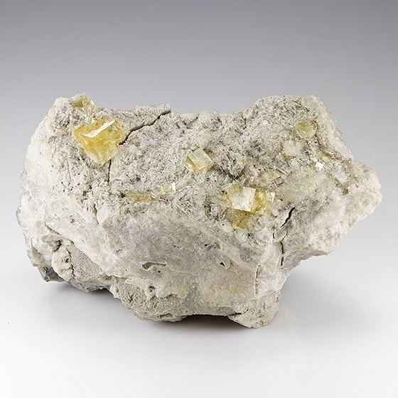 Very pretty glassy gemmy yellow crystals of fluorite to 1.0 cm on edge set on a limestone matrix. This is in really good condition. Nice for this old locality dating back to the early 1970s.Data last checked on 11th Aug 2021 - specimen may no longer be available