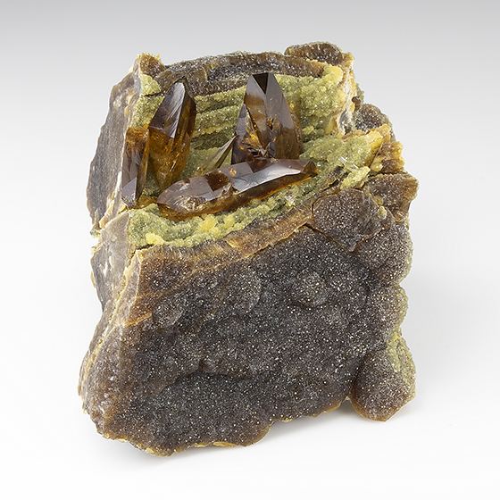 Glassy gemmy amber colored crystals of barite to 2.0 cm in size coming off this matrix with crystallized calcite. Shows well all around, in terrific condition. The quality of these crystals are excellent.Data last checked on 11th Aug 2021 - specimen may no longer be available