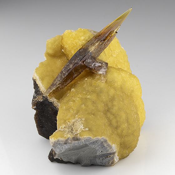 Glassy gemmy crystals of barite to 6.0 cm in size on matrix with yellow calcite. At first it appears that the lower termination on the main double terminated crystal is cleaved, this however is natural.Data last checked on 11th Aug 2021 - specimen may no longer be available