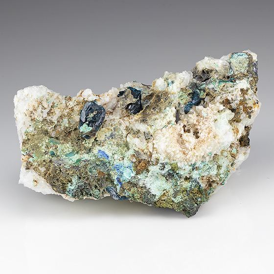 Deep blue crystals of veszelyite to 1.0 cm in size on matrix with hemimorphite and sky-blue platy crystallized theisite. Neat combination piece for these rare minerals. The theisite identity has been confirmed. Tiny and sparse micro-chipping present, overall I think in great condition. Excellent for this rare mineral. From recent finds in early 2021.Data last checked on 11th Aug 2021 - specimen may no longer be available