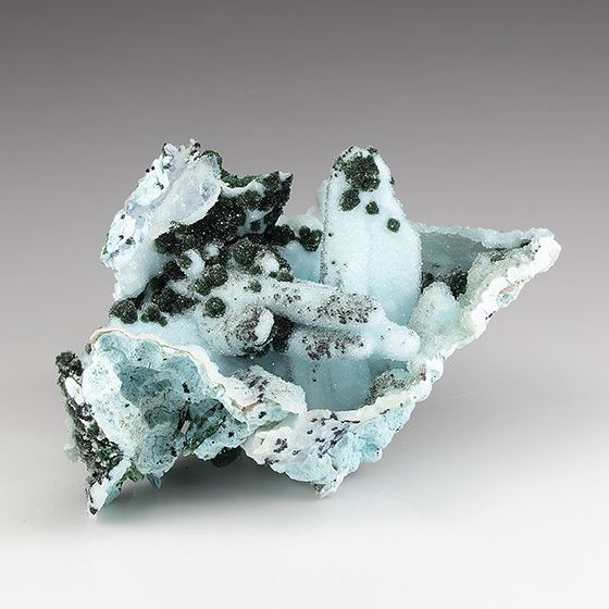 From recent find in the Congo, a beautiful specimen showing bladed crystals of what were likely once azurite or barite measuring to 3.5 cm in length now replaced by sky-blue attractive chrysocolla. Green malachite scattered throughout, the entire specimen coated with a druse of sparkling micro quartz crystals. In very good condition as seen.Data last checked on 11th Aug 2021 - specimen may no longer be available
