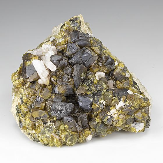 Greenish the black resinous translucent crystals of sphalerite to 1.4 cm in size across the top of this matrix with quartz. In good condition and a nice example for this locality. Many of the crystals exhibit twinning.Data last checked on 11th Aug 2021 - specimen may no longer be available