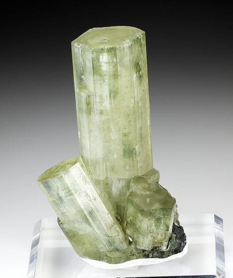 Outstanding cluster of large mostly gemmy glassy prismatic green fluorapatite crystals with minor sphalerite. This has been expertly repaired, the repair is not obvious at all. In super condition all around. Wonderful example from this classic locality. The specimen comes with a custom acrylic base.Data last checked on 11th Aug 2021 - specimen may no longer be available