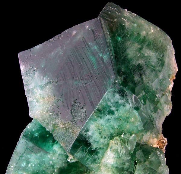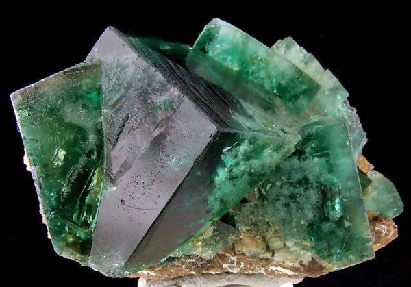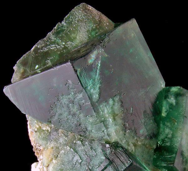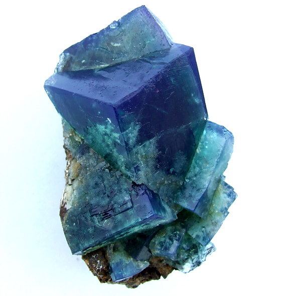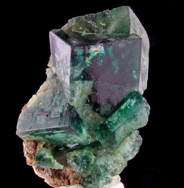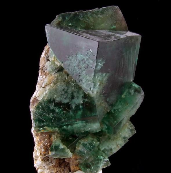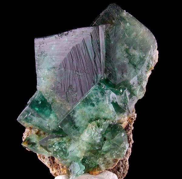 Big gemmy twin perched on the top of the specimen, from world famous locality - Rogerley Mine in UK. Fluorite is showing strong fluorescence in UV light and daylight. Emerald green in incandescent light, blue-green in daylight and electric blue fluorescence in UV light. Crystals size up to 3.2 cm. Specimen from Penny`s Pocket – read more about this pocket here. Specimen mounted to acrylic base Data last checked on 24th Jun 2021 - specimen may no longer be available