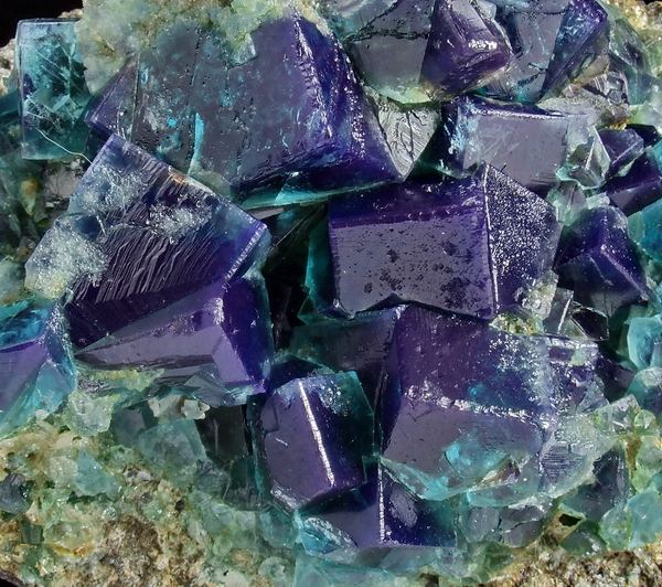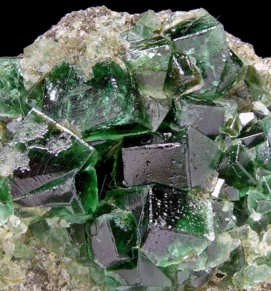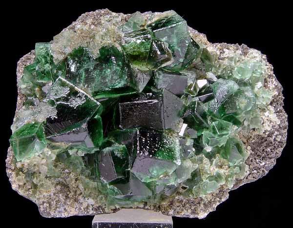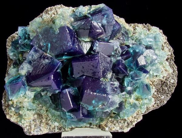 Cubic, gemmy and lustrous crystals of fluorite on matrix from world famous locality – Rogerley Mine in UK. Fluorite is showing strong fluorescence in UV light and daylight. Emerald green in incandescent light, blue-green in daylight and electric blue fluorescence in UV light. Crystals size up to 2.7 cm.;Data last checked on 24th Jun 2021 - specimen may no longer be available